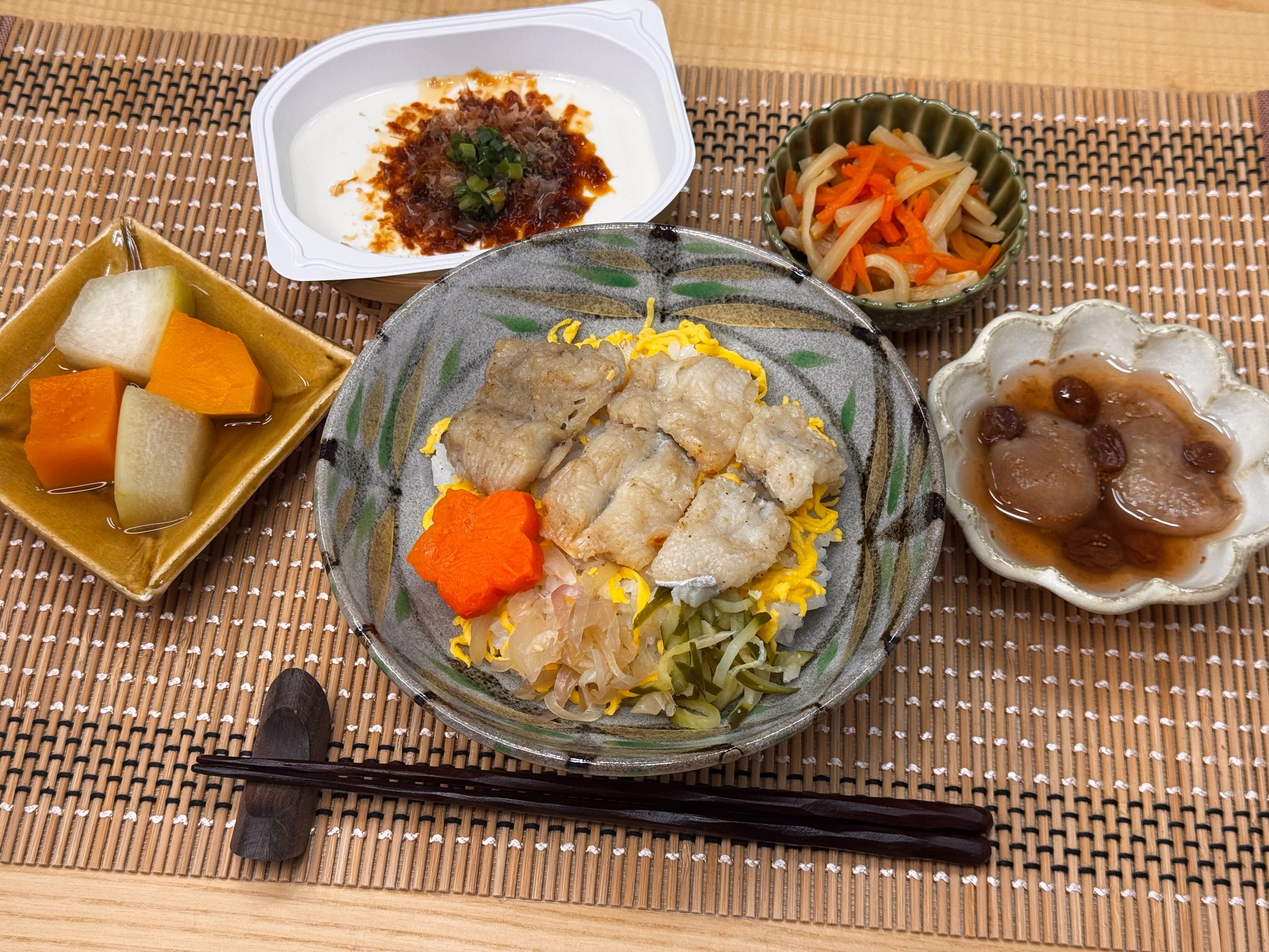 TOP Photo 7/30(水) お食事 Photo 7/30(水) お食事 〈夕食〉1.山椒香る焼き鱧(はも)寿司2.冬瓜と南瓜の含煮3.冷奴(手作り豆腐)4.竹の子のナムル5.無花果とレーズンの洋酒煮熱量556kcal 塩分2.70g Photo